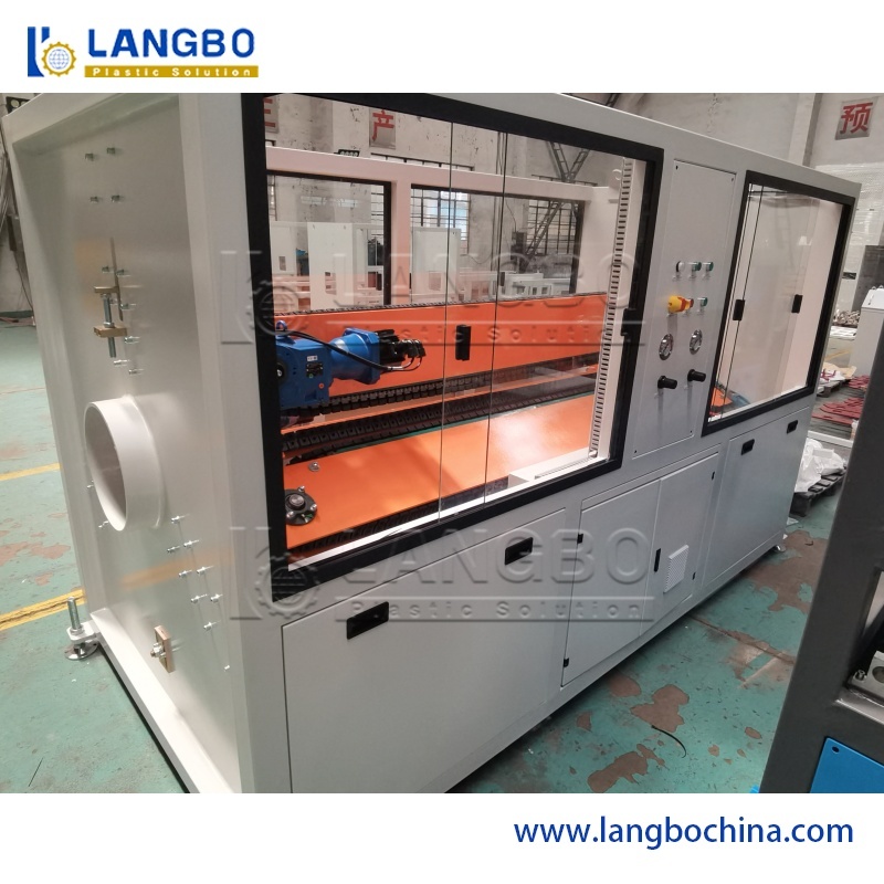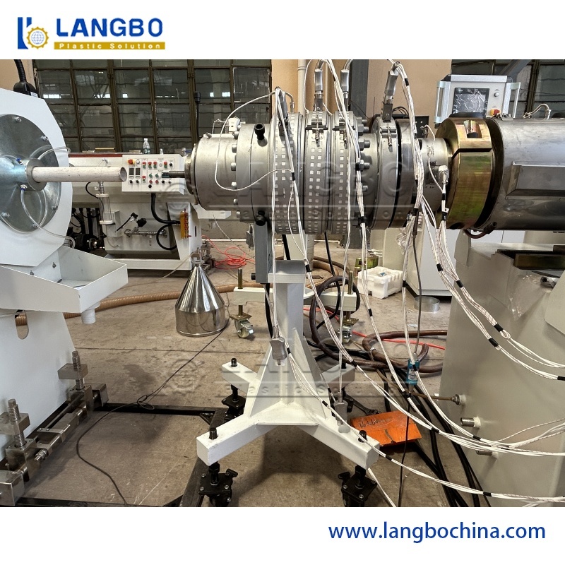 Raw material + additive → Mixing → Material conveying → Forced feeding → Conical twin screw extruder → Extruding mould → Diameter control unit → Spraying vacuum shaping box → Spraying/immersion type cooling water tank → Marking machine → Crawler track tractor → Cutter → Pipe expanding machine → Pipe stacker → Pipe inspection & packing