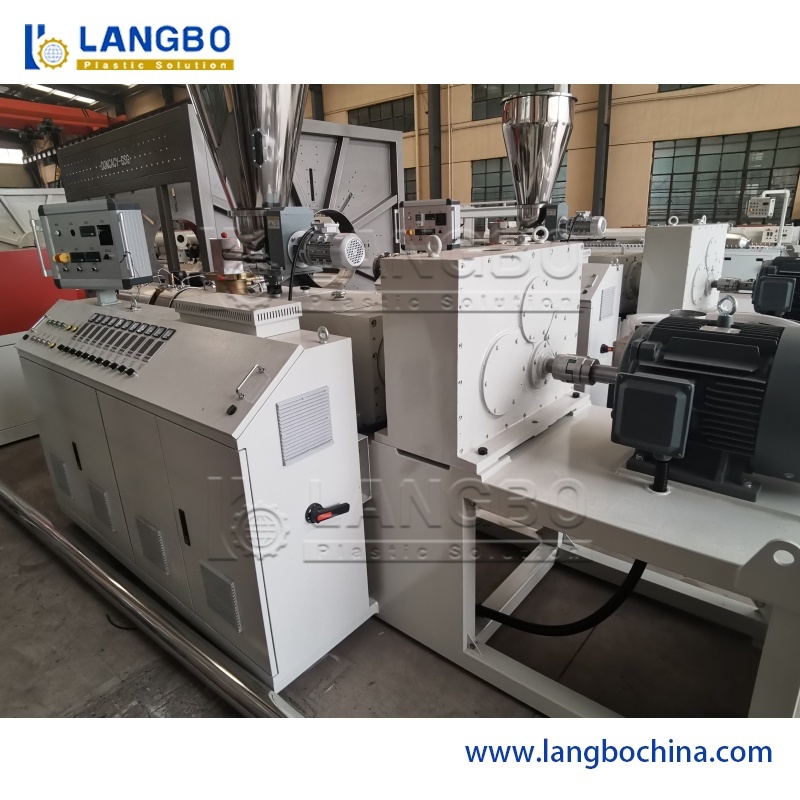 Polvere di PVC + additivi → Miscelazione → alimentazione a molla → Estrusore a doppia vite → Stampo e calibratore → Macchina per la formazione del vuoto → Macchina per il ritiro → Macchina per il taglio → Impilatore.