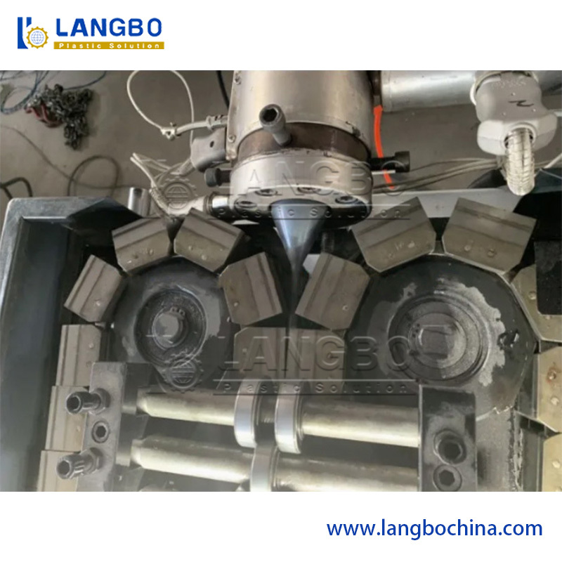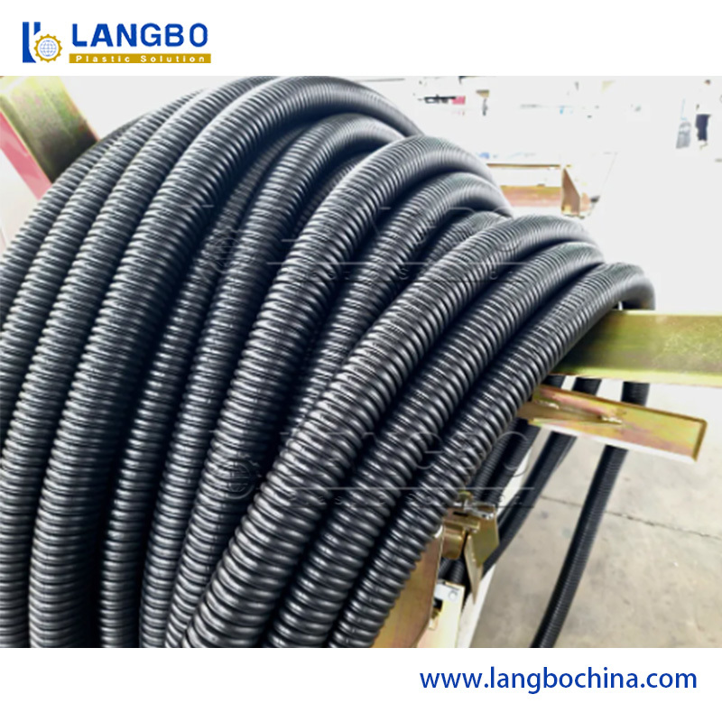 I granuli di plastica vengono immessi nella tramoggia e fonduti nell'estrusore a temperatura e pressione controllate.Il materiale fuso viene poi modellato nel calcolatore di ondulazione mediante il vuoto o la formazione a pressioneDopo la modellazione, i tubi ondulati vengono raffreddati con acqua per stabilizzare la loro forma.