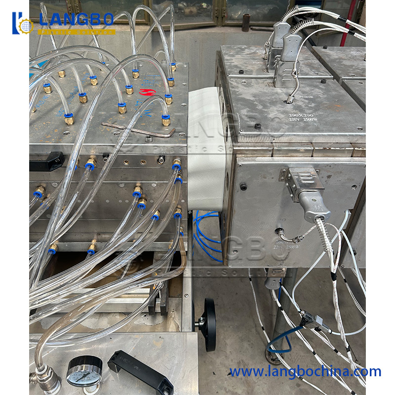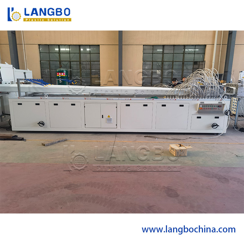 Costruito con telaio in acciaio stabile e corpo in acciaio inossidabile SUS 304.Caratteristiche sistema di regolazione della posizione multidimensionale con pompe d'acqua e calibratori a vuoto disposti con precisione per la rapida modellazione e raffreddamento dei profili in PVC.