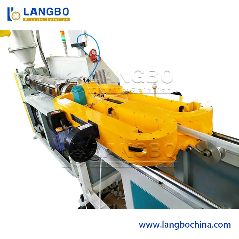 I granuli di plastica vengono immessi nella tramoggia e fonduti nell'estrusore a temperatura e pressione controllate.Il materiale fuso viene poi modellato nel calcolatore a ondulazione per via del vuoto o della formazione a pressioneDopo la modellazione, i tubi ondulati vengono raffreddati con acqua per stabilizzare la loro forma.